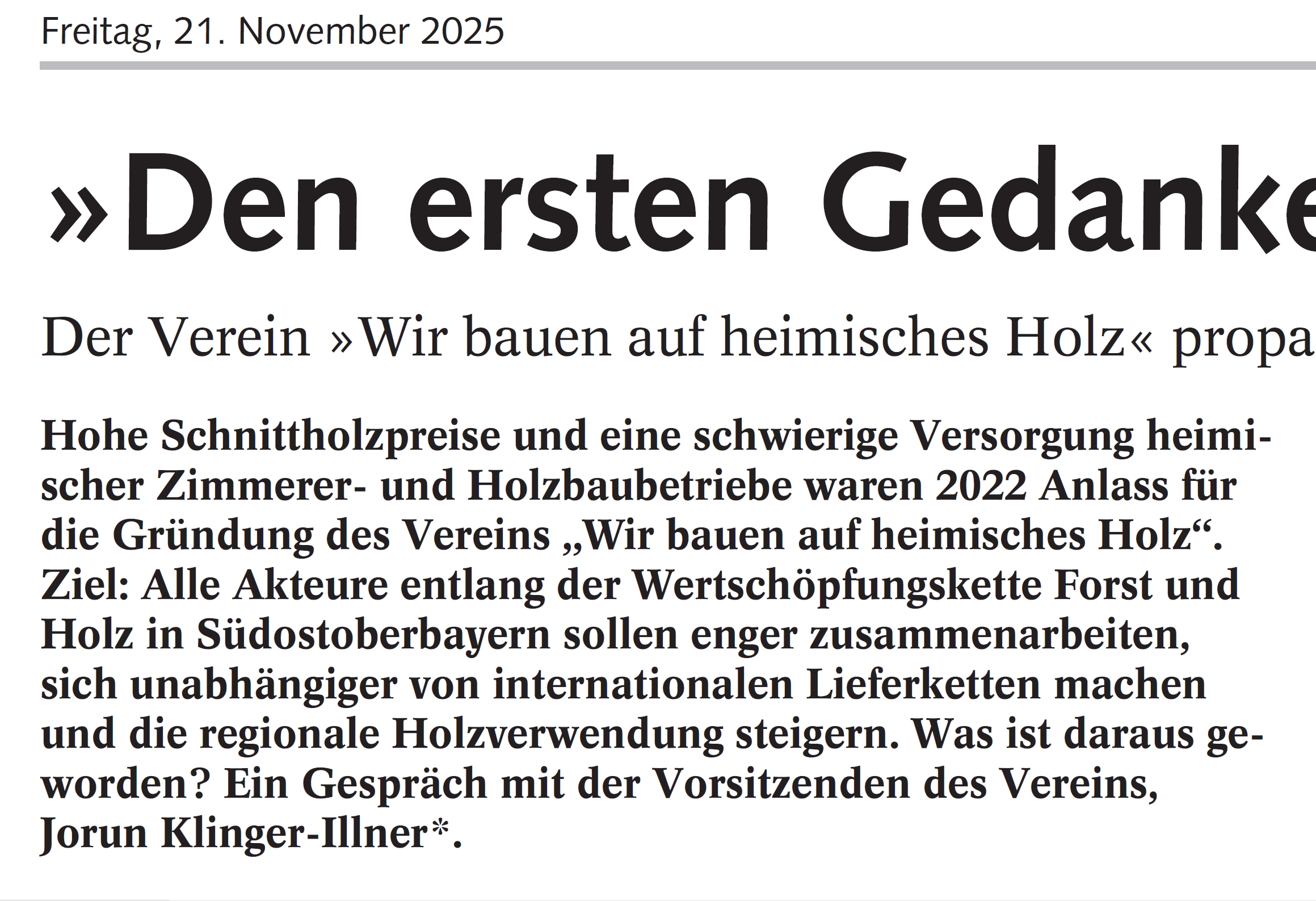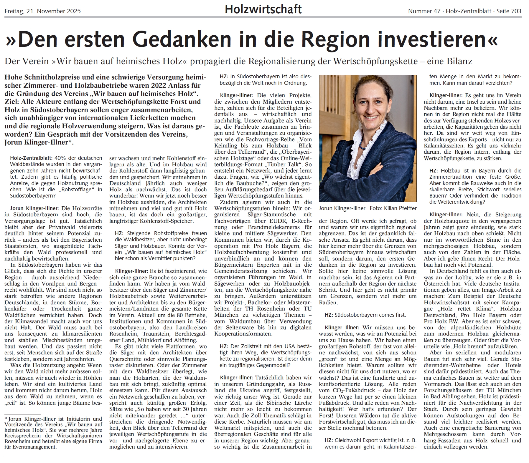 Das Holz-Zentralblatt ist die führende Fach-Zeitung für die Forst- und Holzwirtschaft. Sie interessierte sich für das Projekt der Regionalen Wertschöpfungskette Forst und Holz in Südostoberbayern von Beginn an. Nun veröffentlichten sie ein Interview mit der 1. Vorsitzende des inzwischen gegründeten Vereins „Wir bauen auf heimisches Holz e.V.“ Jorun Klinger-Illner in der Ausgabe vom 21. November 2025.