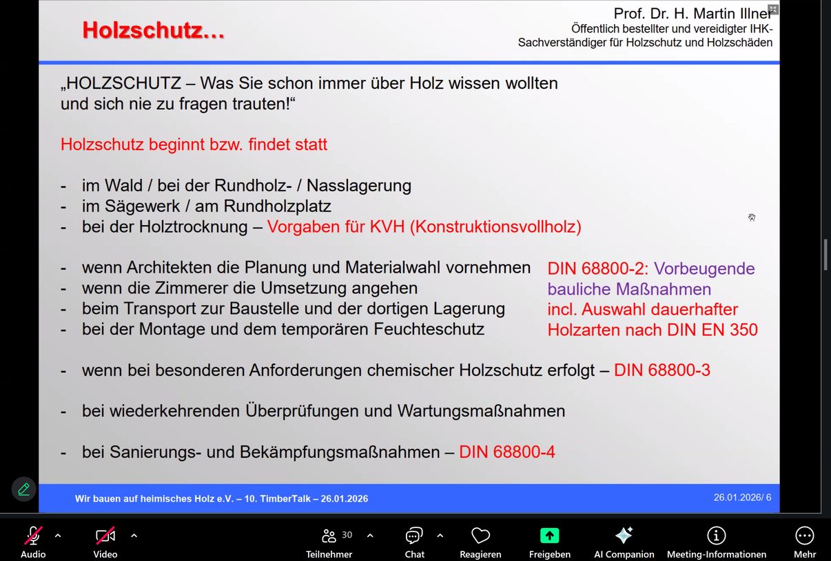 Der 10. Timber Talk am 26. Januar 2026 befasste sich mit dem Thema „HOLZSCHUTZ – Was Sie immer schon über Holz wissen wollten und sich nie zu fragen trauten!“