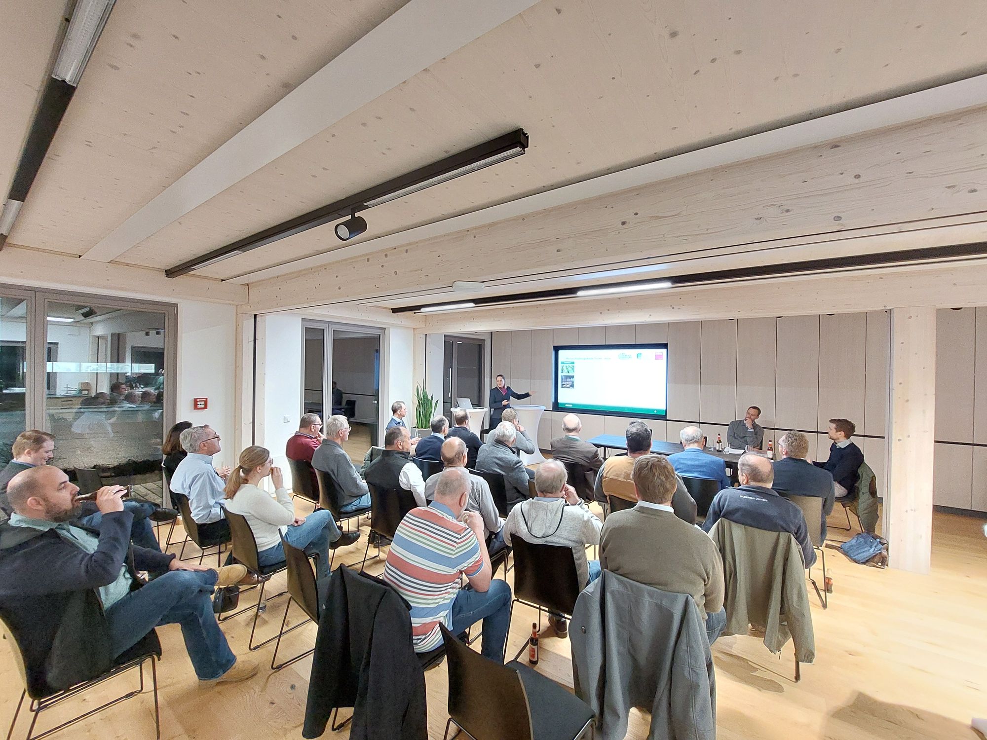 Zur Eröffnung berichtete Thomas Pichler, Obermeister der Zimmerer-Innung Rosenheim über den aktuellen Holzbau in seinem Vortrag „Alle wollen eine bessere Welt – aber oana muas bauen!“ Auch ein weiterer Vortrag zum Projekt „Mehrgenerationenwohnen in Kranzberg“ von Johannes Dantele, Freising informierte zum Thema.
