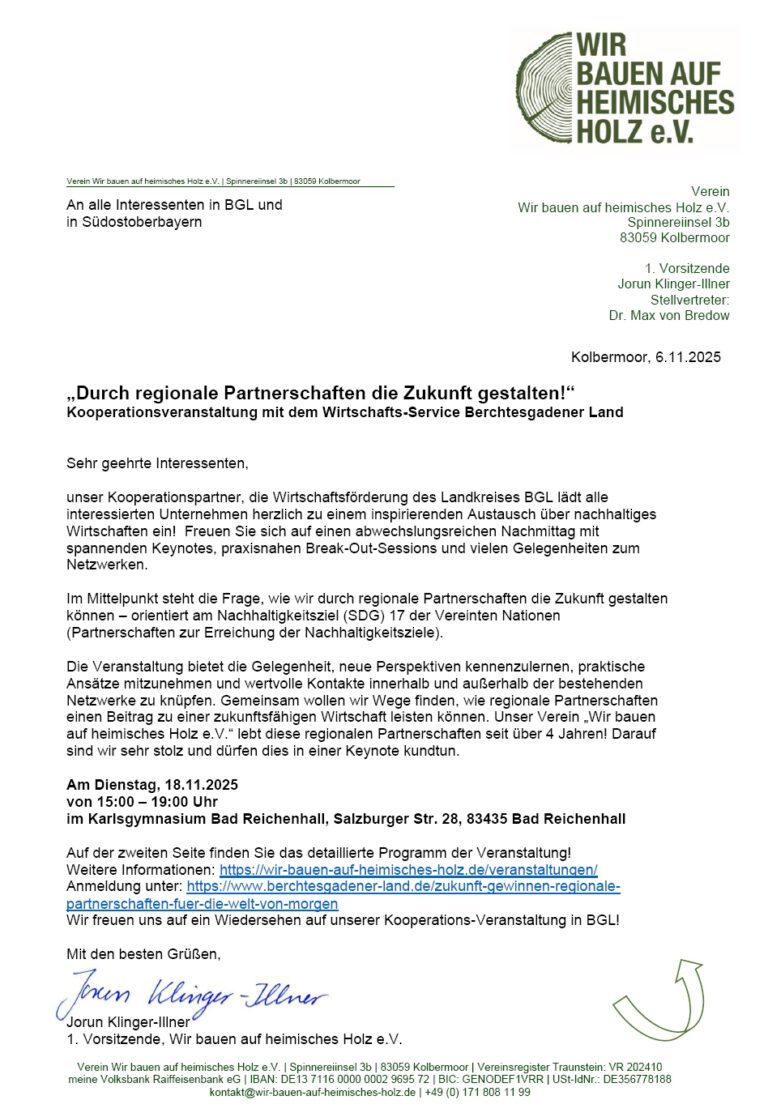 In Kooperation mit dem Verein „Wir bauen auf heimisches Holz e.V.“ organisiert der Berchtesgadener Land Wirtschaftsservice eine Veranstaltung zur Stärkung regionaler Partnerschaften.
