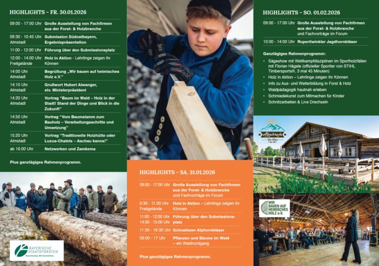 Seit letztem Jahr findet die Südostbayernsubmission im „Almdorado“ in Übersee am Chiemsee statt. Die Location bietet mit seinen großzügigen Freiflächen für Submissionsplatz und Informationsstände sowie dem urigen „Almstadl“ Potential für mehr. Dieses Mehr – besser gesagt ein „Meer“ aus Aktivitäten – nutzen die Organisatoren der „Oberbayerischen Holztage“. Am Freitag, den 30. Januar 2026, für die, Wertholz-Submission der Bayerischen Staatsforsten und der Waldbesitzervereinigungen, zu Vorführungen aus der Forst-, Säge- und Zimmerer-Praxis sowie zu Fachvorträgen „Vom Keimling bis zum Holzbau – Blick über den Tellerrand“ vom Verein „Wir bauen auf heimisches Holz e.V.“.